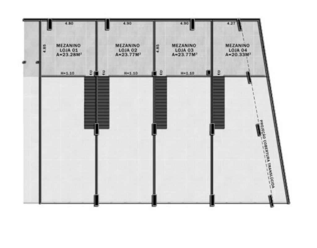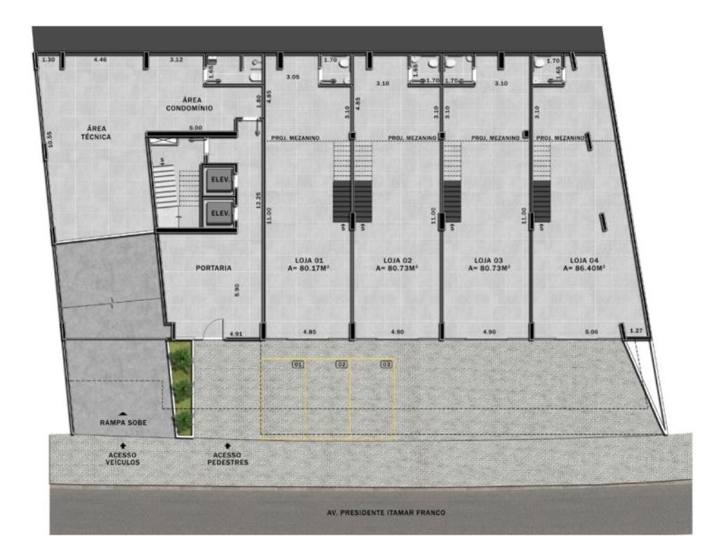 Com 106,73m² de área total, o espaço é distribuído entre uma loja ampla, com pé-direito alto e bom padrão de acabamento, e uma sobreloja com possibilidade de ampliação, permitindo a criação de um mezanino ainda maior e mais funcional, adaptável a diferentes tipos de negócio.