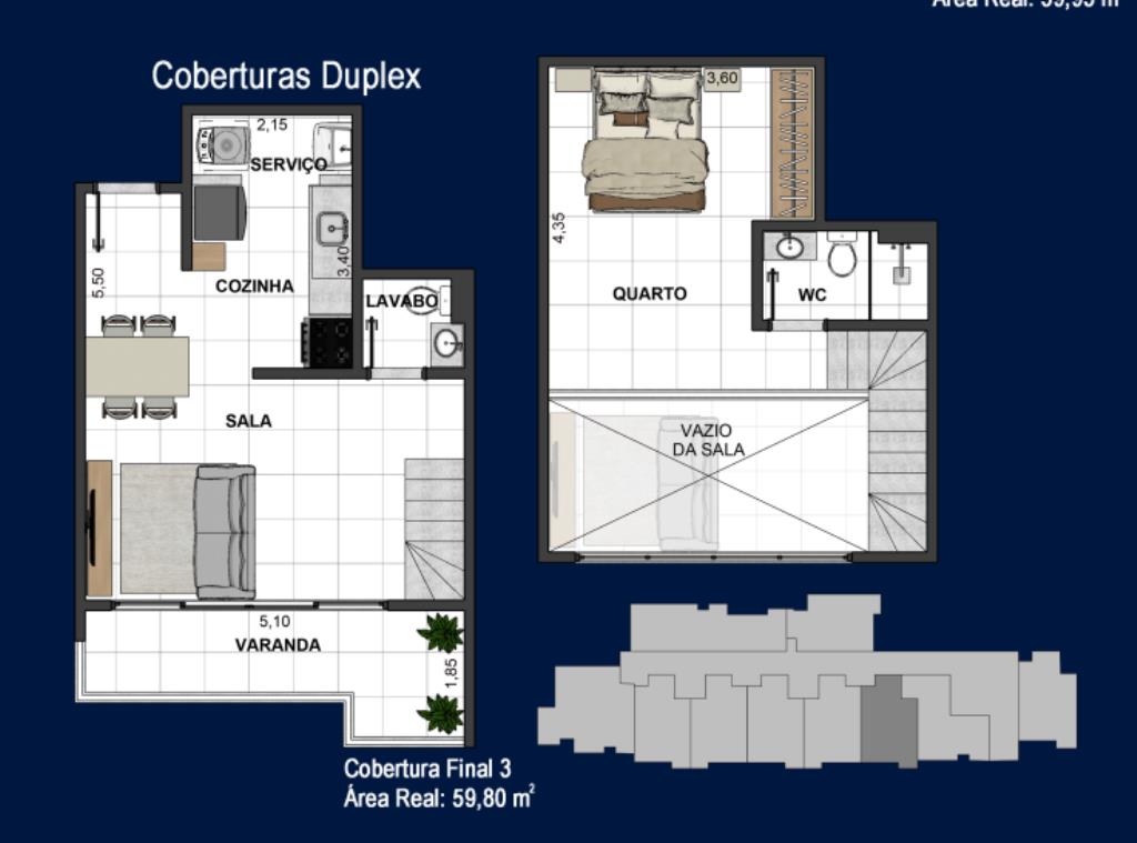 Spazio Residence Club com coberturas duplex de sala e quarto no bairro São Mateus na Ladeira Alexandre Leonel. Quarto com armário de 3 portas, cama box de casal, 2 apoios com gaveta ao lado da cama, ar condicionado split e cortina na janela; sala com sofá de dois lugares, mesa de madeira com 4 cadeiras, cortina na porta da varanda e previsão de instalação de ar condicionado; cozinha com geladeira, armários, forno de microondas, fogão a gás 4 bocas; área de serviço com ponto para máquina de lavar; banheiro com armário sob o lavatório, kit de acessórios de banheiro, chuveiro elétrico e box blindex; lavabo com armário sob o lavatório e kit de acessórios e 1 vaga de garagem.