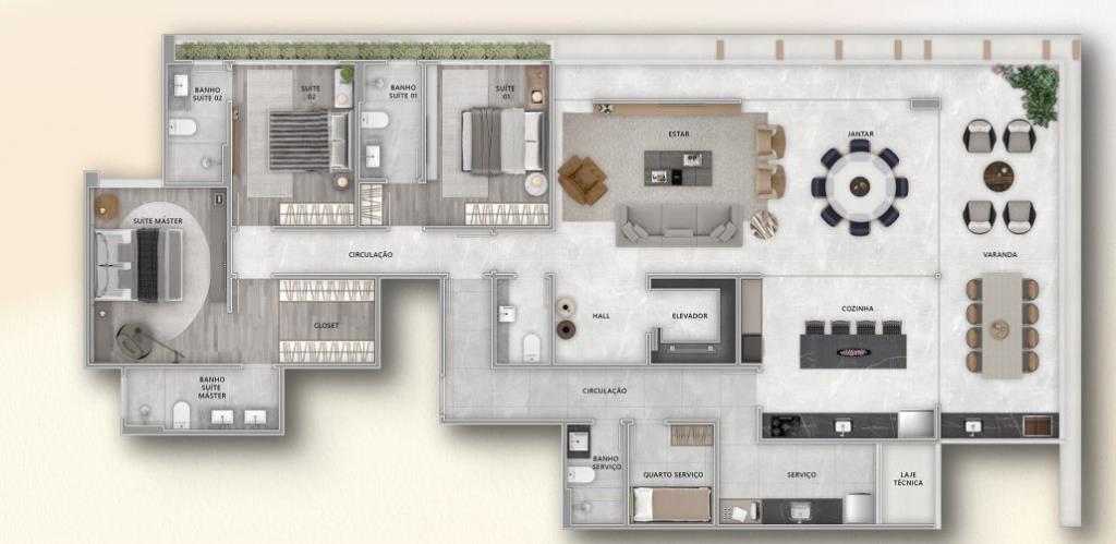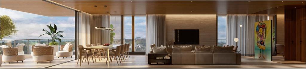 Apartamentos de 270 m² com 3 suítes sendo a suíte master com closet, varanda gourmet com 35 m², hall privativo e 3 vagas de garagem com um ponto de recarga para veículos elétricos.