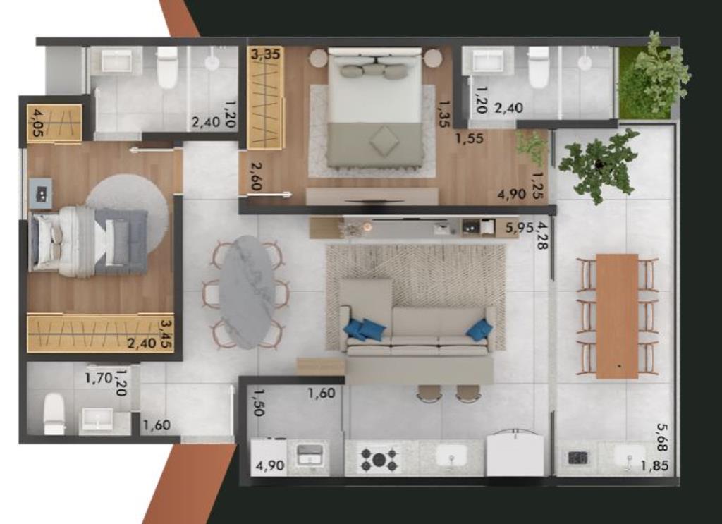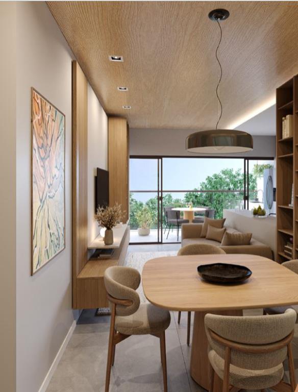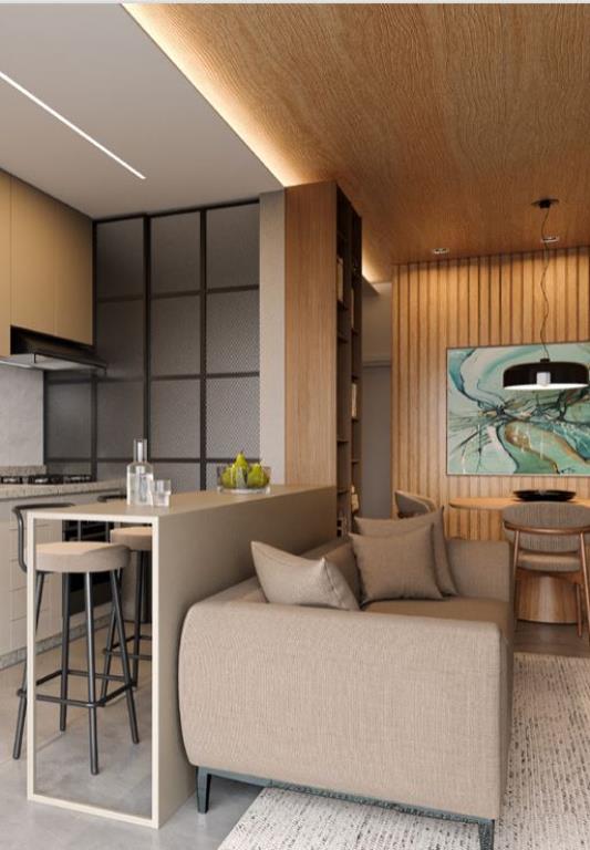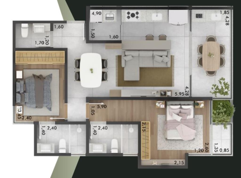 Apartamento com 2 suítes; sala de estar/jantar com varanda privativa; lavabo; cozinha; área de serviço e 2 vagas de garagem.