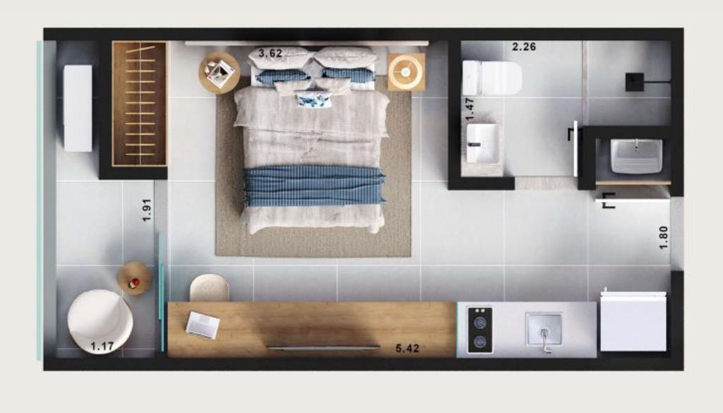 Projetado para oferecer praticidade e conforto, o apartamento estúdio é uma excelente opção para quem busca um espaço funcional e bem aproveitado. A unidade conta com varanda, garantindo maior ventilação e luminosidade, além de um ambiente integrado que une quarto, sala e cozinha de forma otimizada.