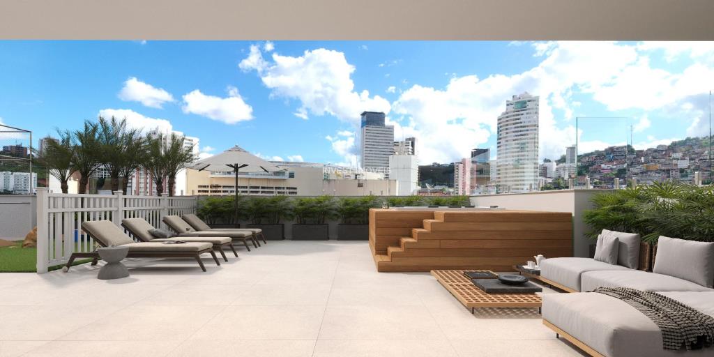 O prédio tem área de lazer no terraço com três espaços gourmet, spa, mini quadra, coworking, sala de reunião, espaço pet e brinquedoteca.