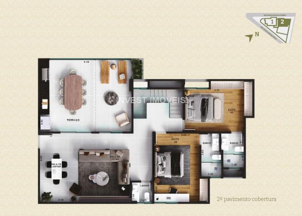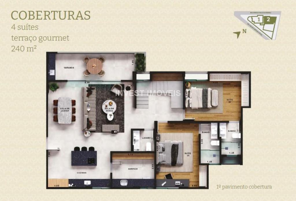 A sala, ampla e bem iluminada, comporta de dois a tres ambientes e se integra a um varandão gourmet com vista incrível para o bairro, perfeito para momentos de relaxamento. Ainda na sala temos a escada que dá acesso ao 2° andar desta cobertura. O imóvel conta ainda com lavabo social completo, além de piso laminado de madeira nos quartos, trazendo aconchego e requinte.