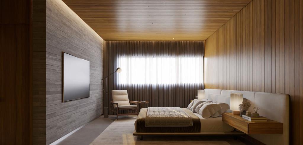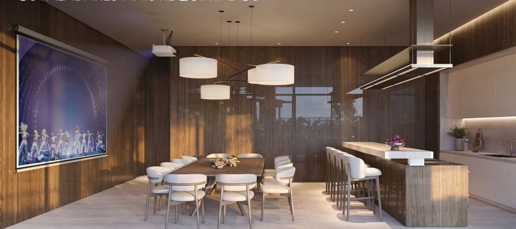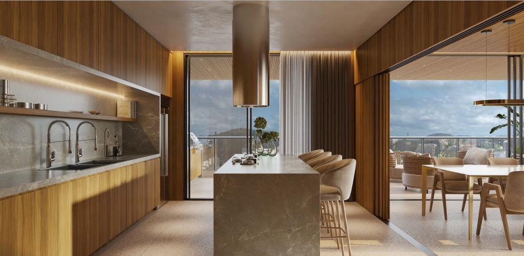 Apartamentos de 270 m² com 4 suítes sendo a suíte master com closet, varanda gourmet com 39 m², adega, hall privativo e 3 vagas de garagem com um ponto de recarga para veículos elétricos.